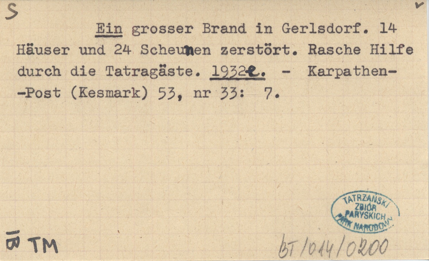 Ein grosser Brand in Gerlsdorf. 14 Häuser und 24 Scheunen zerstört. Rasche Hilfe durch die Tatragäste. 1932 e
