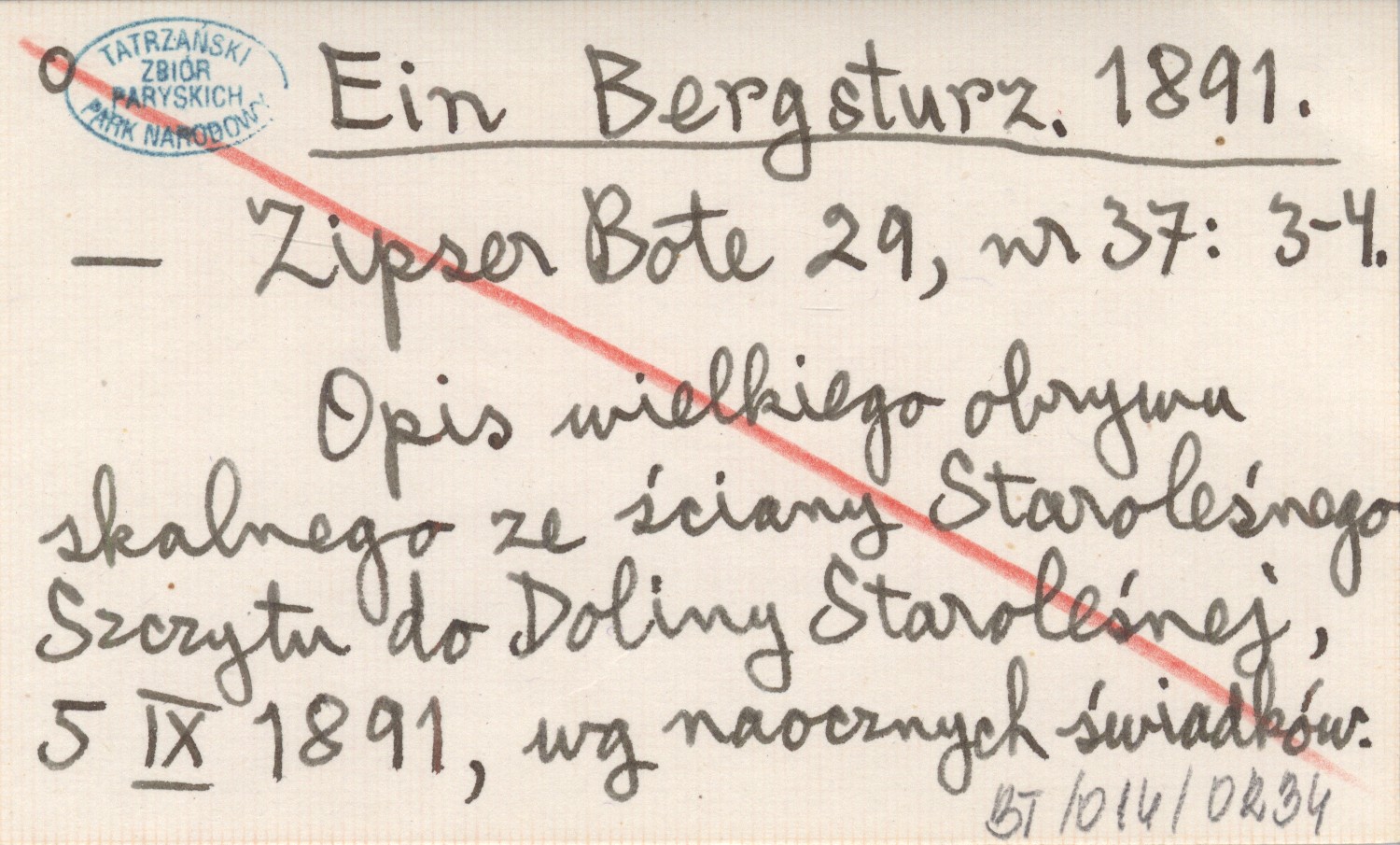 Zipser Bote, 29, nr 37: 3-4. Opis wielkiego obrywu skalnego ze ściany Staroleśnego Szczytu do Doliny Staroleśnej. 5 IX 1891, wg naocznych świadków.