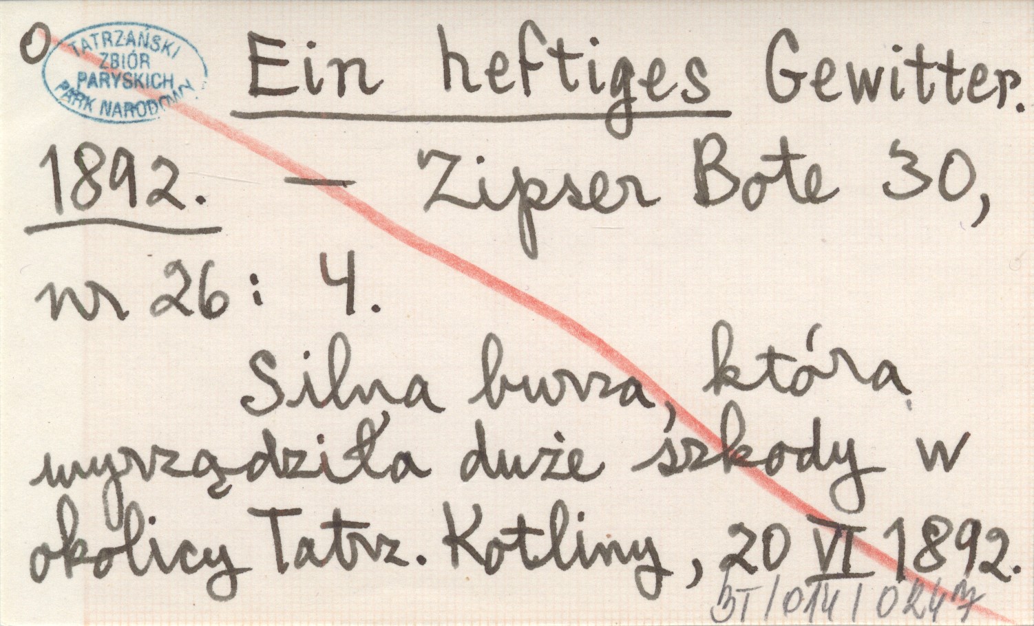 Zipser Bite, 30, nr 26: 4. Silna burza, która wyrządziła duże szkody w okolicy Tatrz. Kotliny, 20 VI 1892.