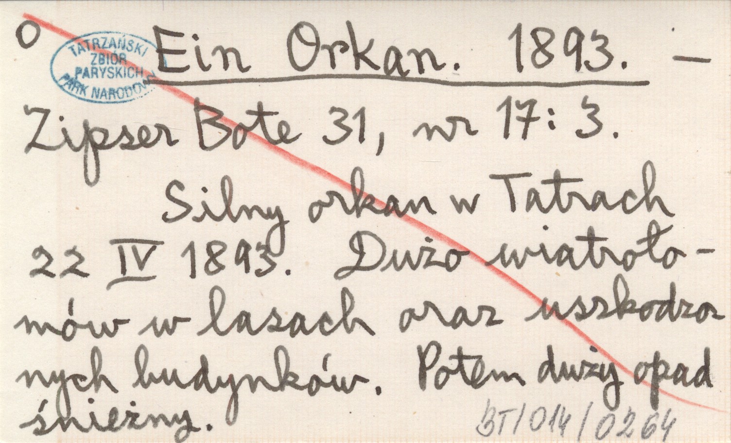Zipser Bote, 31, nr 17: 3. Silny orkan w Tatrach 22 IV 1893. Dużo wiatrołomów w lasach oraz uszkodzonych budynków. Potem duży opad śnieżny.