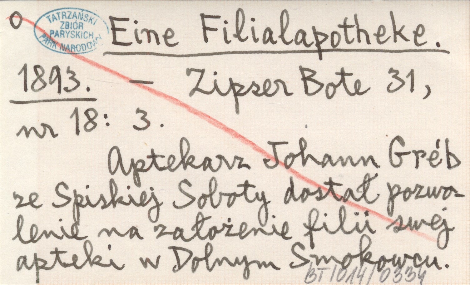 Zipser Bote, 31, nr 18: 3. Aptekarz Johann Gréb ze Spiskiej Soboty dostał pozwolenie na założenie filii swej apteki w Dolnym Smokowcu.