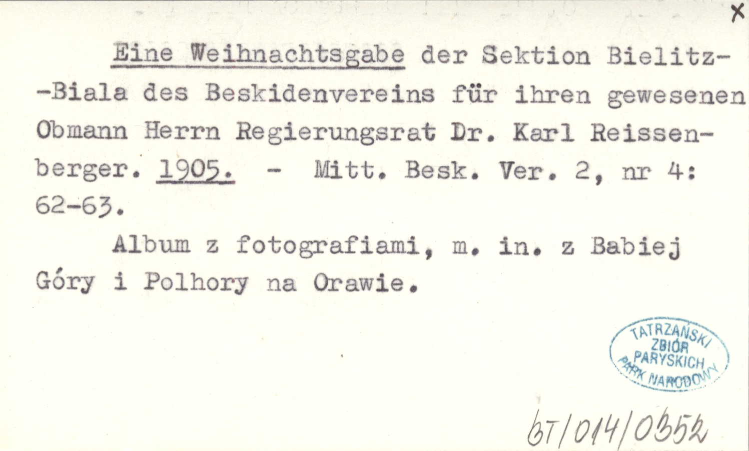 Eine Weihnachtsgabe der Sektion Bielitz-Biala des Beskidenvereins für ihren gewesenen Obmann Herrn Regierungsrat Dr. Karl Reissenberger. 1905