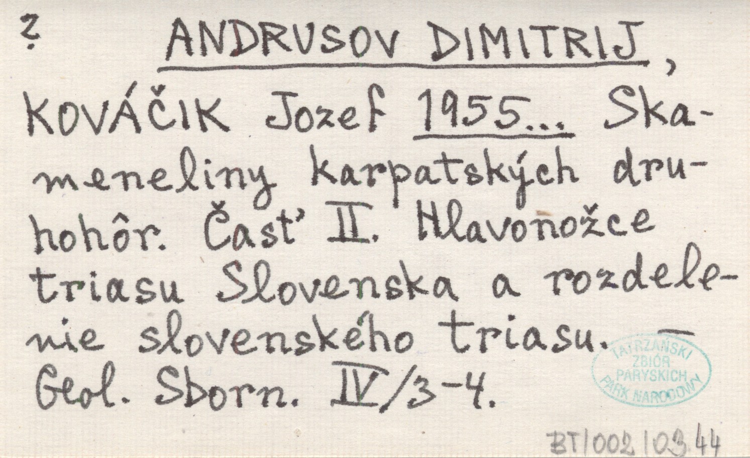 ANDRUSOV Dimitrij KOVÁÈIK, Jozef. ; 1955... Skameneliny karpatskęch druhohôr. Èast II. HlavonoŸce triasu Slovenska a rozdelenie slovenského triasu.
