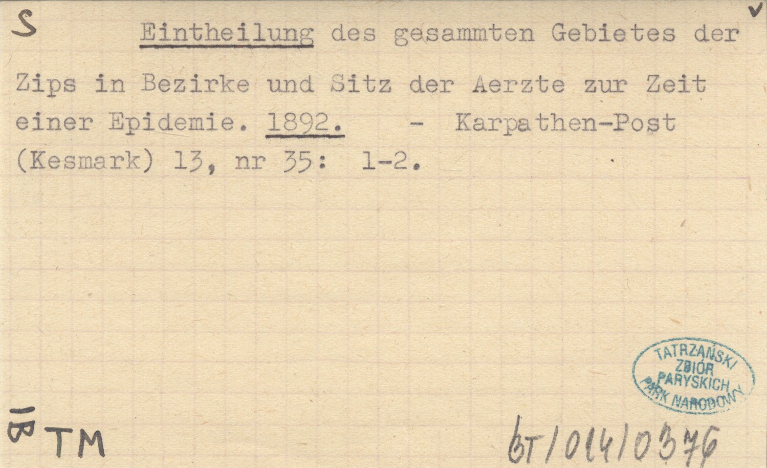 Eintheilung des gesammten Gebietes der Zips in Bezirke und Sitz der Aerzte zur Zeit einer Epidemie. 1892