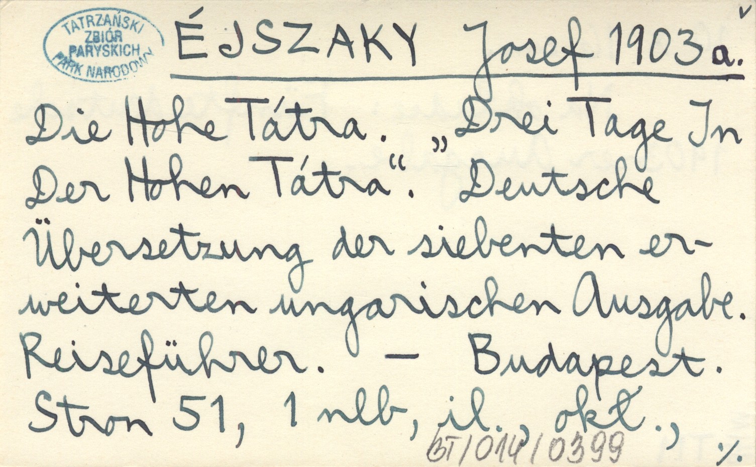ÉJSZAKY Josef 1903 a Die Hohe Tátra. "Drei Tage In Der Hohen Tátra". Deutsche Übersetzung der siebenten erweiterten ungarischen Ausgabe. Reiseführer.