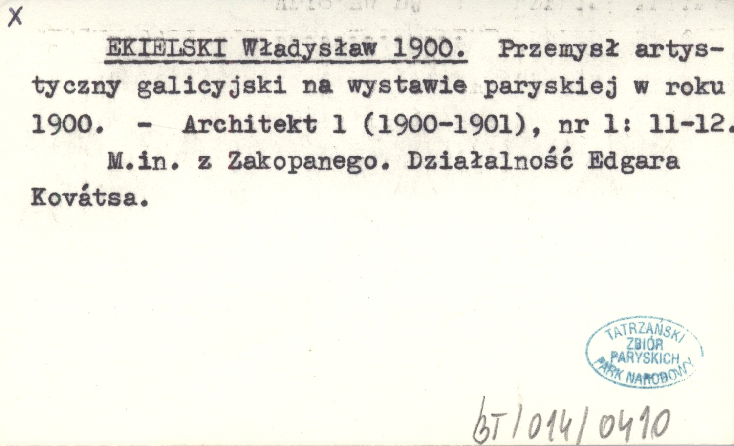 Architekt, 1 (1900-1901), nr 1: 11-12. M. in. z Zakopanego. Działalność Edgara Kovátsa.