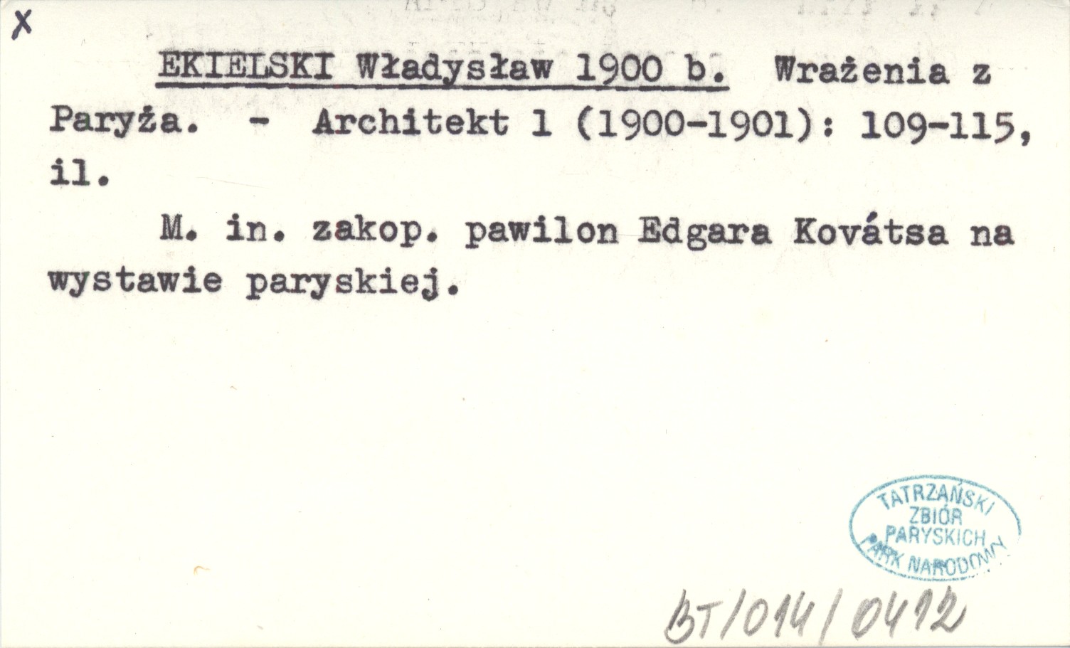 Architekt, 1 (1900-1901): 109-115, il. M. in. zakopiański pawilon Edgara Kovátsa na wystawie paryskiej.