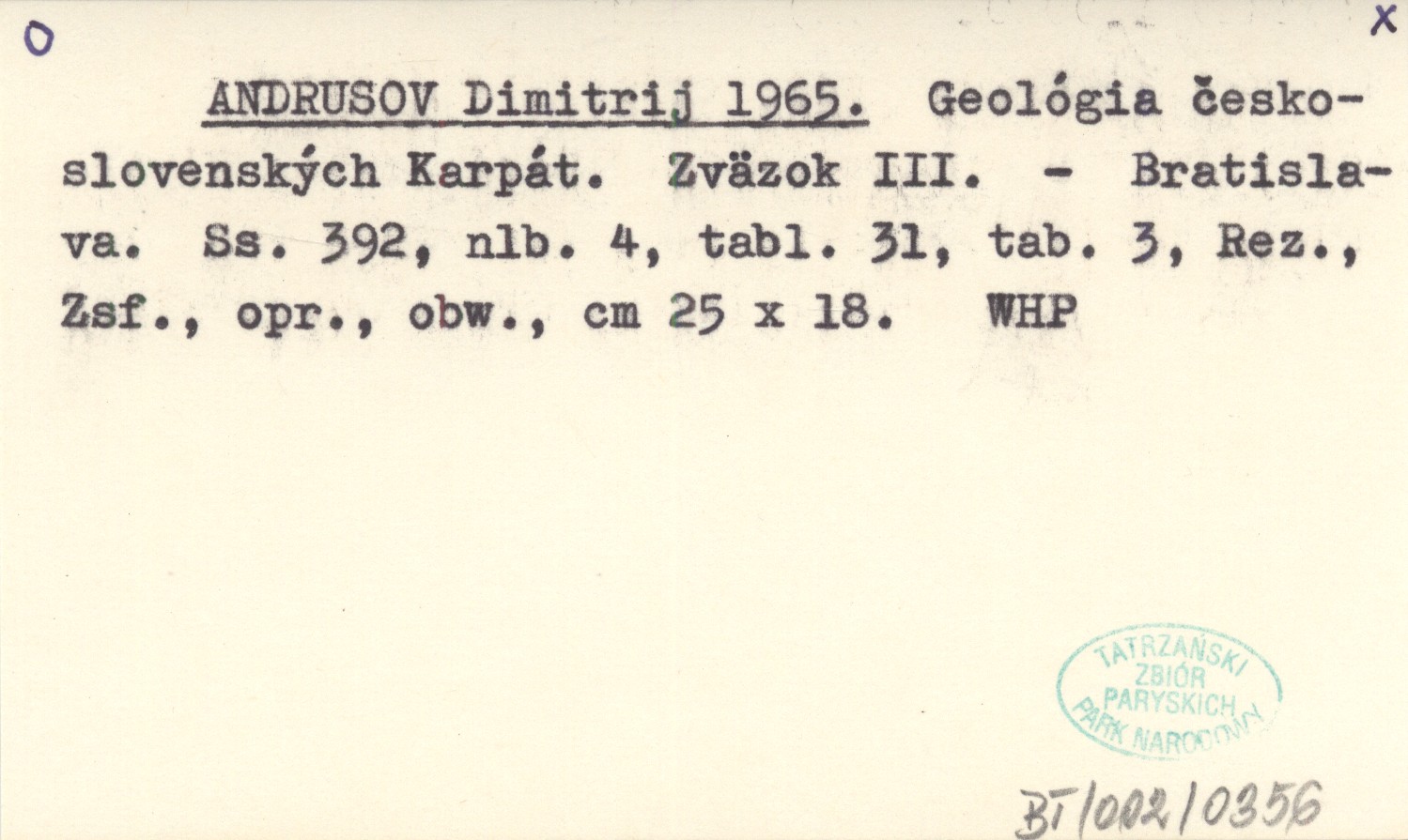 ANDRUSOV Dimitrij 1965 Geológia československých Kárpat. Zväzok III.