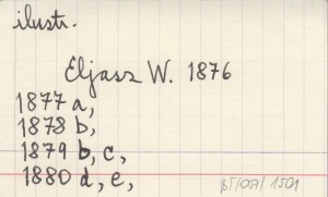 Pamiętnik Towarzystwa Tatrzańskiego, 5: okł. s. [1], il. Tylko drzeworyt: rys. W. Eljasz (Rytownik nie jest podany). Winieta ta jest podobna w ogólnej kompozycji do winiety tegoż autora w poprz. tomach, ale jest odrębnym dziełem i różni się wieloma szczegółami: orzeł patrzy w prawo, góral jest inny i częściowo inaczej ubrany, u stóp skały nie ma świerka, ale jest kozica i dwa świstaki, itd. Napis na panoramie ("Tatry") i na wstędze ("W góry...") są jak na poprz. winiecie.