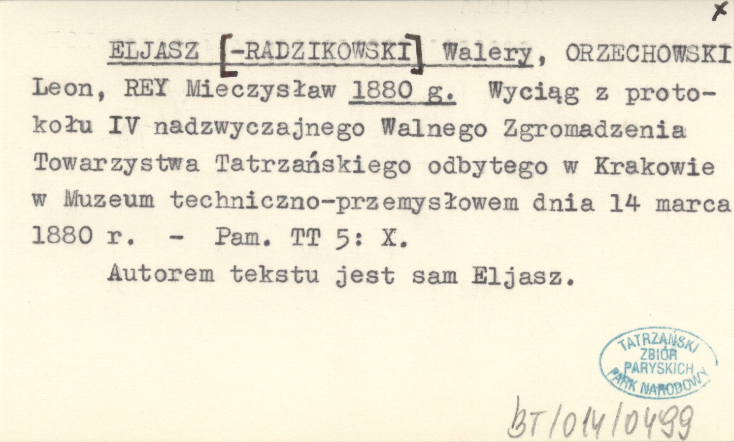 ELJASZ [-RADZIKOWSKI] Walery ORZECHOWSKI, Leon. ; REY, Mieczysław. ; 1880 g Wyciąg z protokołu IV nadzwyczajnego Walnego Zgromadzenia Towarzystwa Tatrzańskiego odbytego w Krakowie w Muzeum techniczno-przemysłowem dnia 14 marca 1880 r.