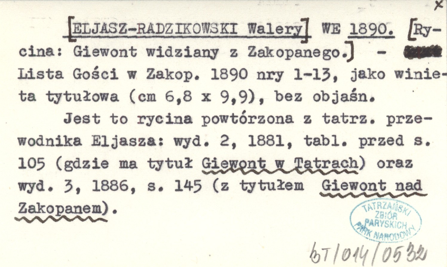 Lista Gości w Zakop., 1890, nr 1-13. Jako winieta tytułowa (6,8x9,9 cm), bez objaśn. Jest to rycina powtórzona z tatrz. przewodnika Eljasza: wyd. 2, 1881, tabl. przed s. 105 (gdzie ma tytuł Giewont w Tatrach) oraz wyd. 3, 1886, s. 145 (z tytułem Giewont nad Zakopanem).