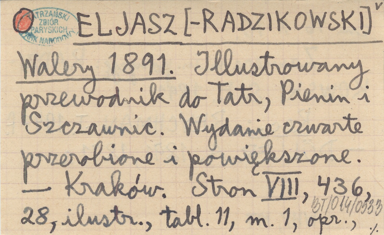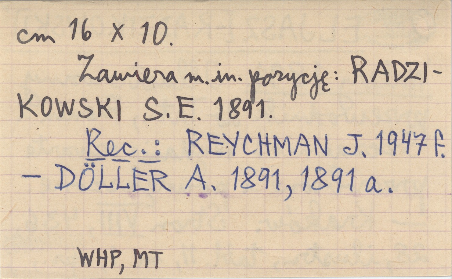 WYD: 4 przer. i uzup. Kraków , VIII, 436, 28 s., il., 11 k., 1 mapa, opr., 16x10 cm. Zawiera m. in. pozycję: RADZIKOWSKI S. E. 1891. REC: REYCHMAN J. 1947 f ; DÖLLER A. 1891, 1891 a ;