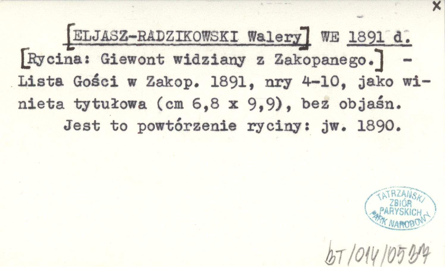 Lista Gości w Zakop. 1891 , Nr 4-10. Jako winieta tytułowa (6,8x9,9 cm), bez objaśn. Jest to powtórzenie ryciny: jw. 1890.
