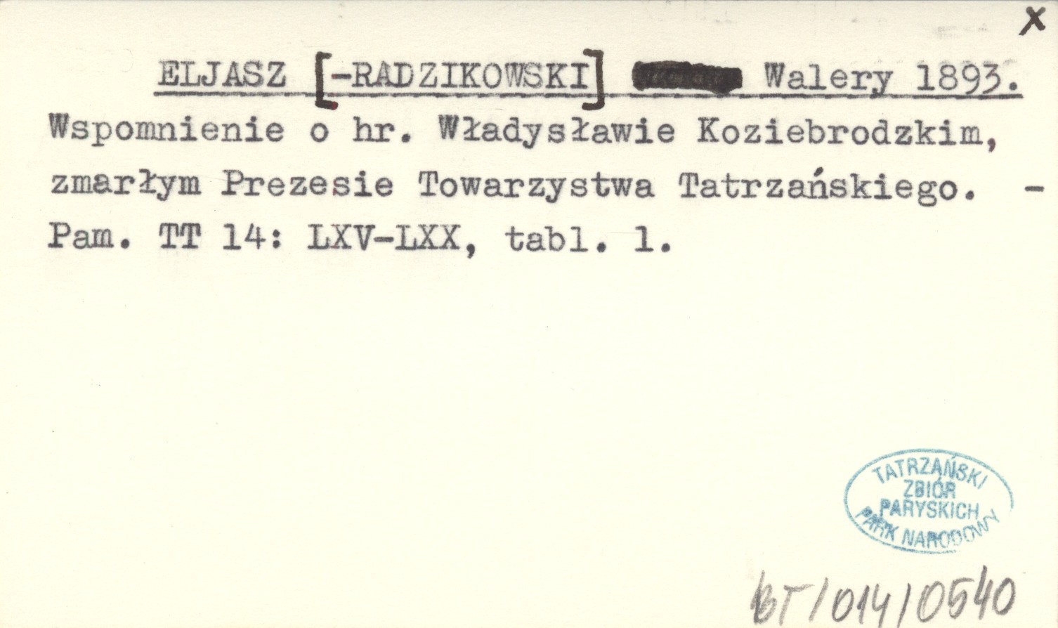 ELJASZ [-RADZIKOWSKI] Walery 1893 Wspomnienie o hr. Władysławie Koziebrodzkim, zmarłym Prezesie Towarzystwa Tatrzańskiego.