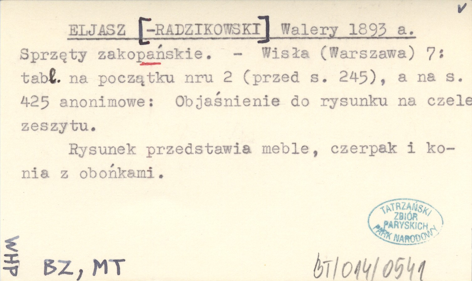 ELJASZ [-RADZIKOWSKI] Walery 1893 a Sprzęty zakopańskie.