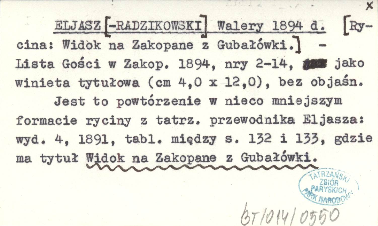 Lista Gości w Zakop., Nr 2-14. Jako winieta tytułowa (4x12 cm), bez objaśn. Jest to powtórzenie w nieco mniejszym formacie ryciny z tatrz. przewodnika Eljasza: wyd. 4, 1891, tabl. między s. 132 i 133, gdzie ma tytuł Widok na Zakopane z Gubałówki.