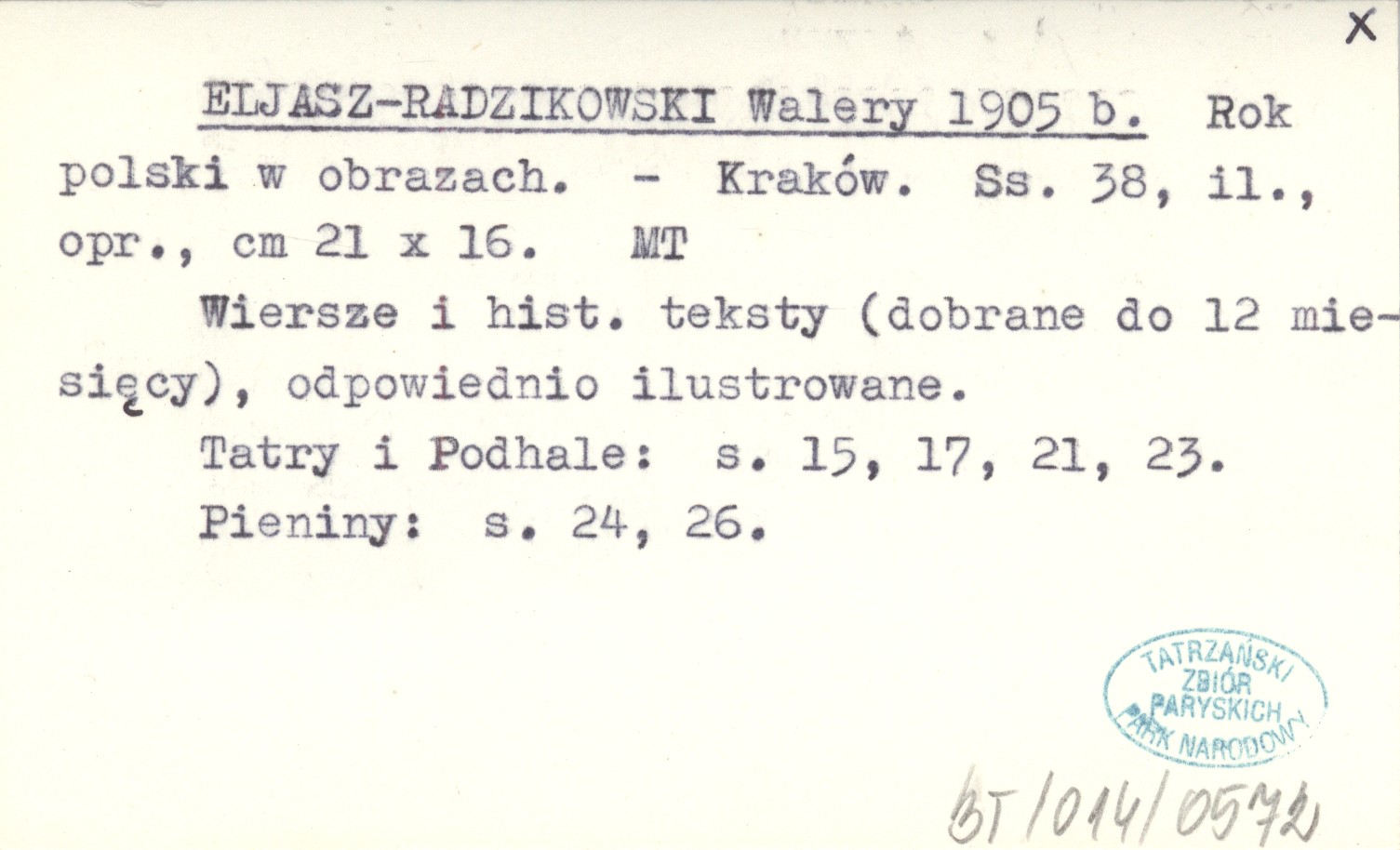 Kraków , 38 s., il., opr., 21x16 cm. Wiersze i historyczne teksty (dobrane do 12 miesięcy), odpowiednio ilustrowane. Tatry i Podhale: s. 15, 17, 21, 23. Pieniny: s. 24, 26.