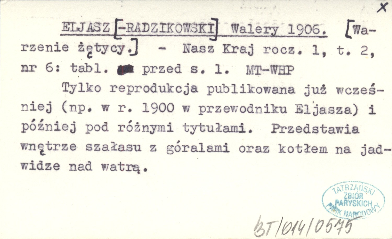 Nasz Kraj, R. 1, t. 2, nr 6: tabl. przed s. 1. Tylko reprodukcja publikowana już wcześniej (np. w r. 1900 w przewodniku Eljasza) i później pod różnymi tytułami. Przedstawia wnętrze szałasu z góralami oraz kotłem na jadwidze nad watrą.