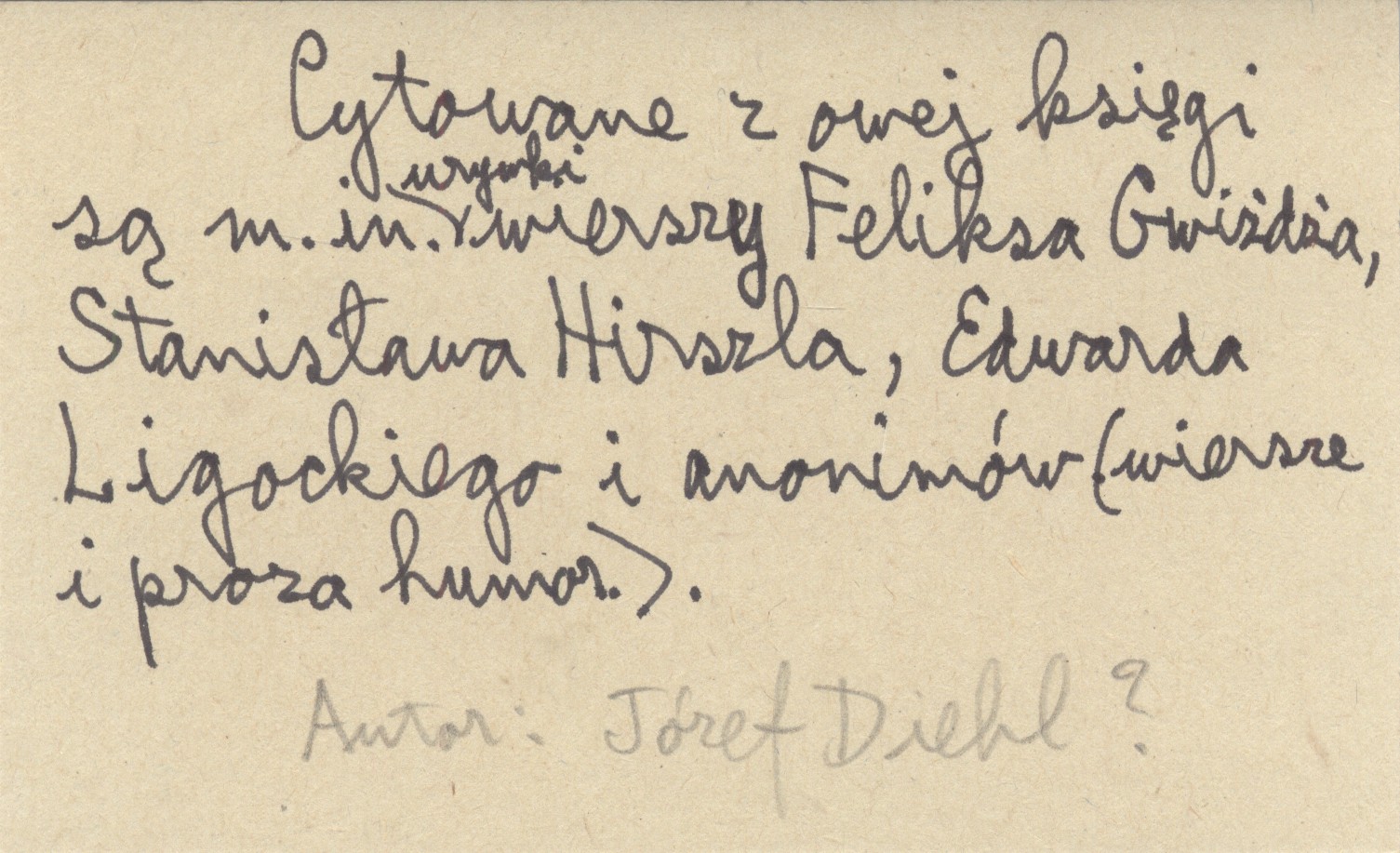 Zakopane, 5, nr 28: 5-7. Urywki z "zielonej księgi" Sekcji Narciarskiej TT w Zakopanem z komentarzami. Cytowane z owej księgi są m. in. urywki wierszy Feliksa Gwiżdża, Stanisława Hirszla, Edwarda Ligockiego i anonimów (wiersze i proza humorystyczna). Autor: Józef Diehl?