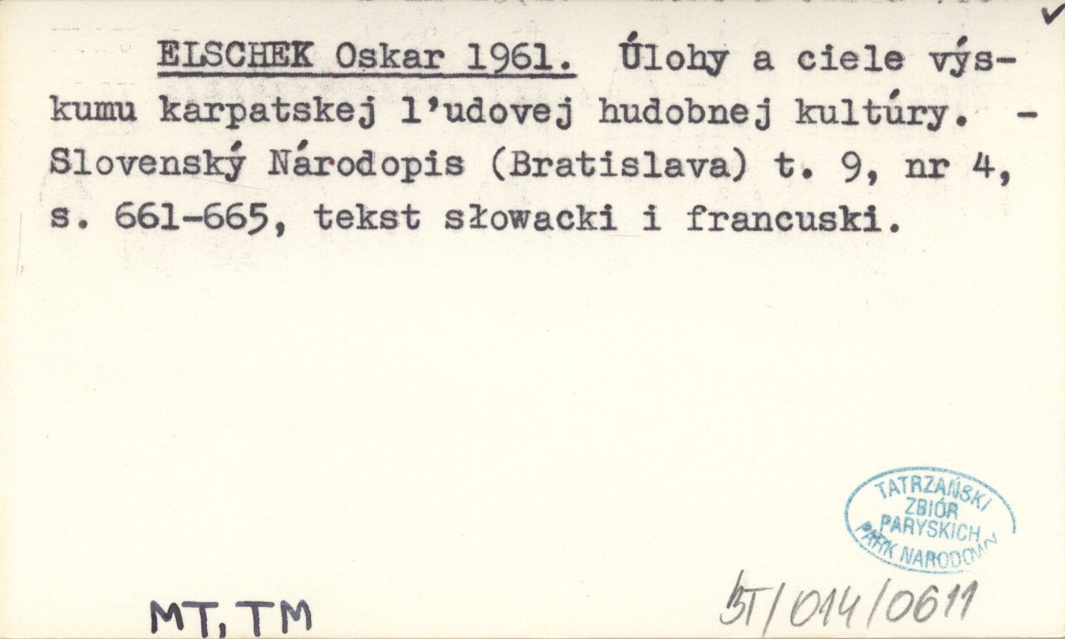 ELSCHEK Oskar 1961 Úlohy a ciele vęskumu karpatskej ”udovej hudobnej kultúry.