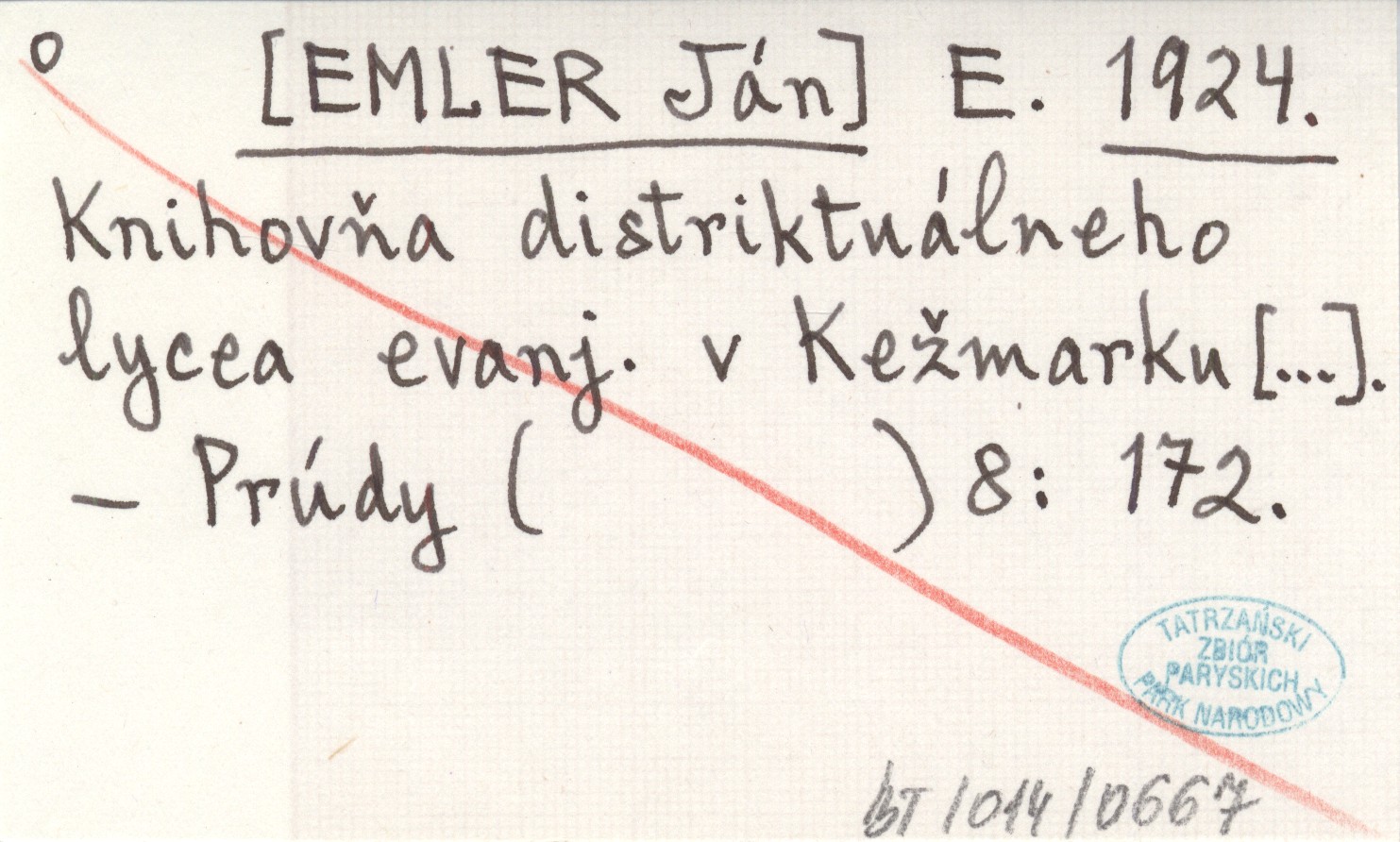 E. [EMLER Ján] 1924 Knihovňa distriktuálneho lycea evanj. v Kežmarku [...].