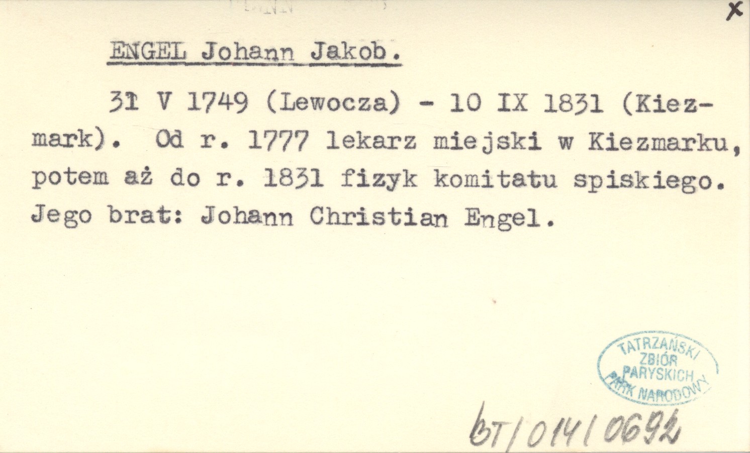 31 V 1749 (Lewocza) - 10 IX 1831 (Kiezmark). Od r. 1777 lekarz miejski w Kiezmarku, potem aż do r. 1831 fizyk komitatu spiskiego. Jego brat: Johann Christian Engel.