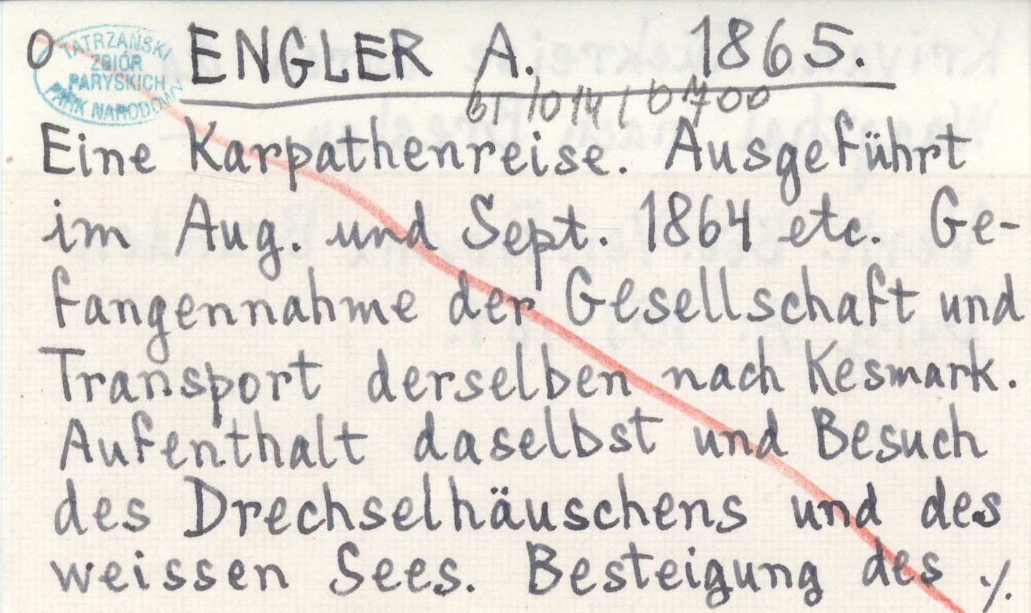 ENGLER A. 1865 Eine Karpathenreise. Ausgeführt im Aug. und Sept. 1864 etc. Gefangennahme der Gesellschaft und Transport derselben nach Kesmark. Aufenthalt daselbst und Besuch des Drechselhäuschens und des weissen Sees. Besteigung des Krivan. Rückreise durch das Waagthal nach Breslau.