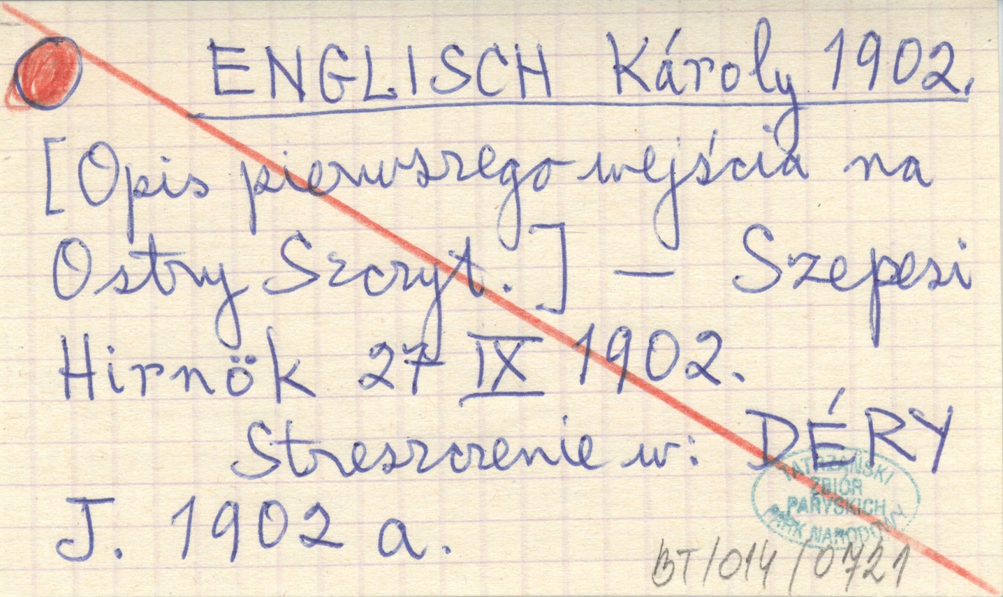 ENGLISCH Károly 1902 [Opis pierwszego wejścia na Ostry Szczyt.]