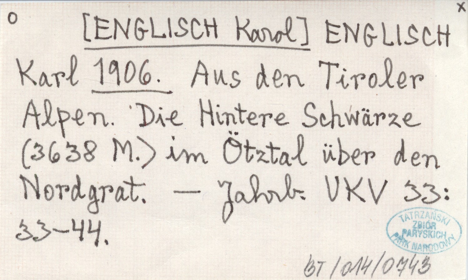 ENGLISCH Karl [ENGLISCH Karol] 1906 Aus den Tiroler Alpen. Die Hintere Schwärze (3638 M.) im Ötztal über den Nordgrat.