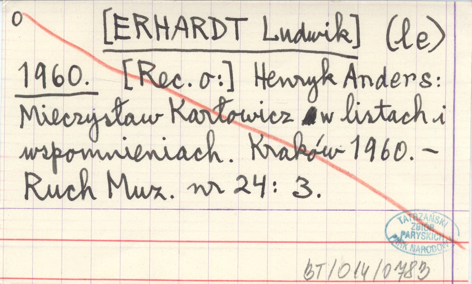 (le) [ERHARDT Ludwik] 1960 [Rec. o:] Henryk Anders: Mieczysław Karłowicz w listach i wspomnieniach. Kraków 1960.