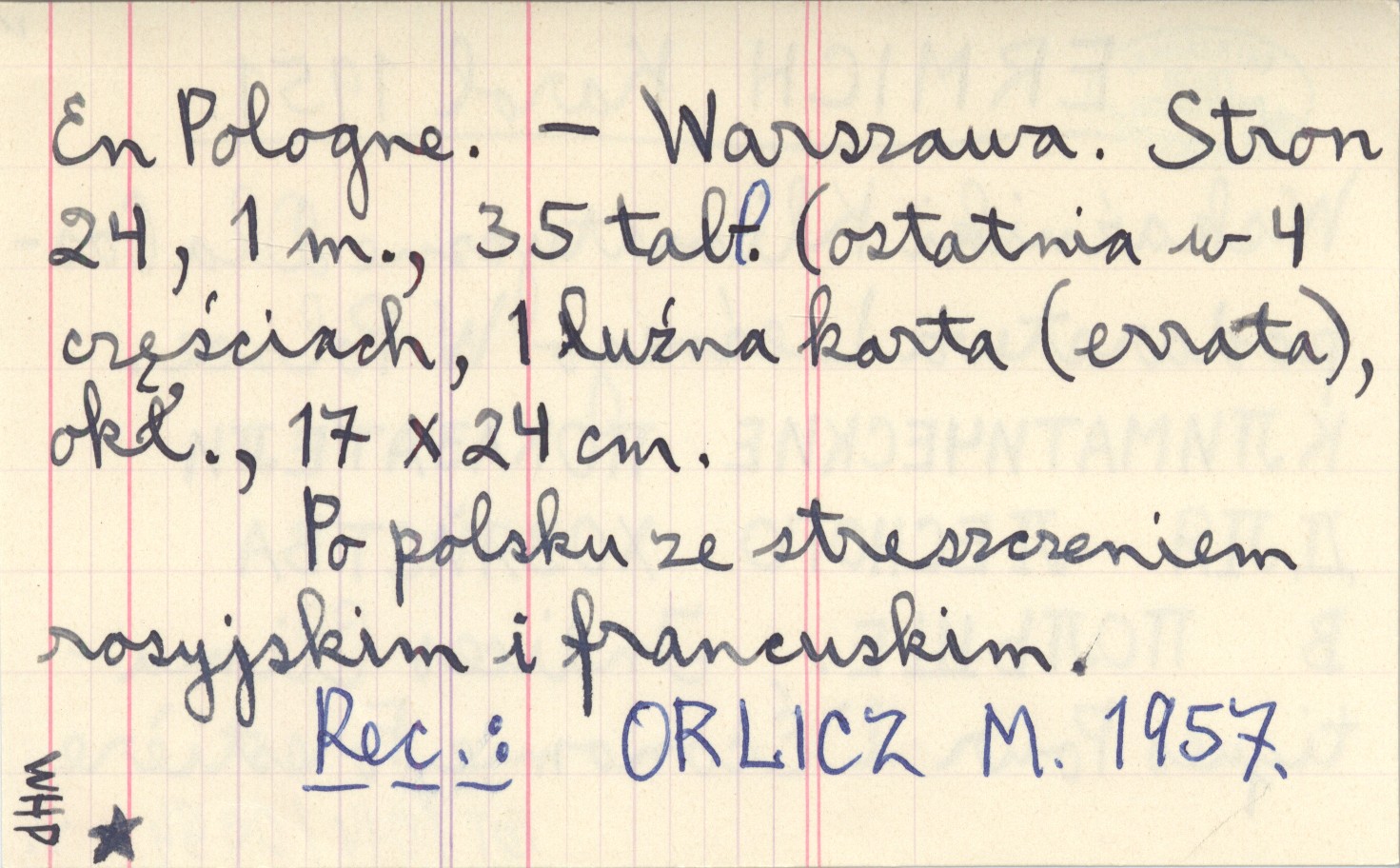 Warszawa , 24 s., 1 mapa, 35 k. (ostatnia w 4 częściach, 1 luźna k. (errata), okł., 17x24 cm. Po polsku ze streszczeniem rosyjskim i francuskim. REC: ORLICZ M. 1957