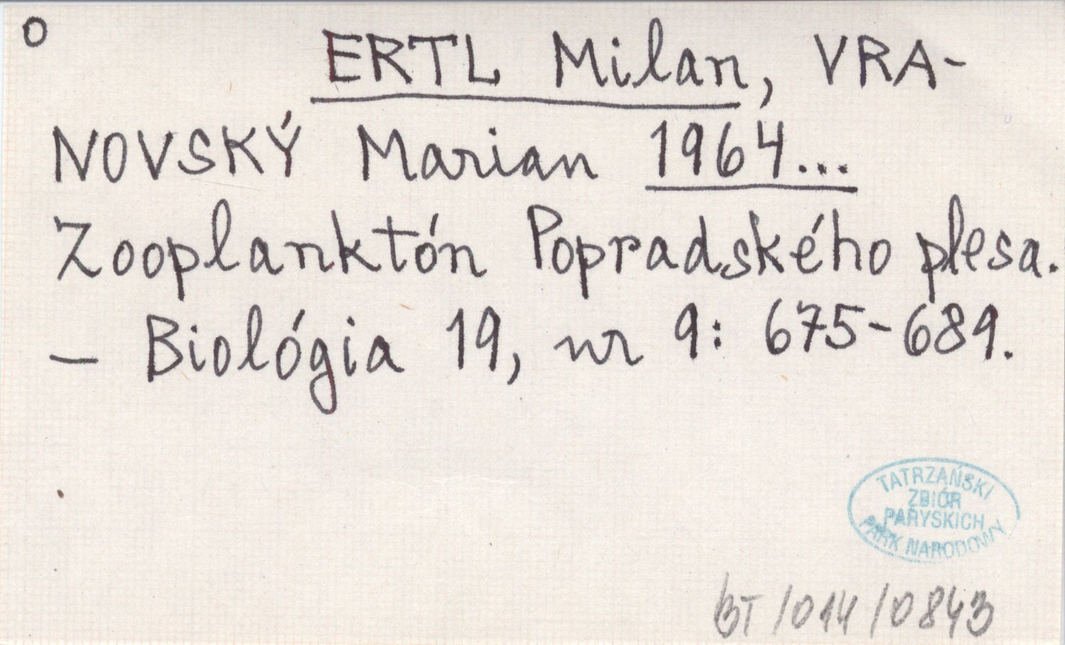 ERTL Milan VRANOVSKÝ, Marian. ; 1964... Zooplanktón Popradského plesa.