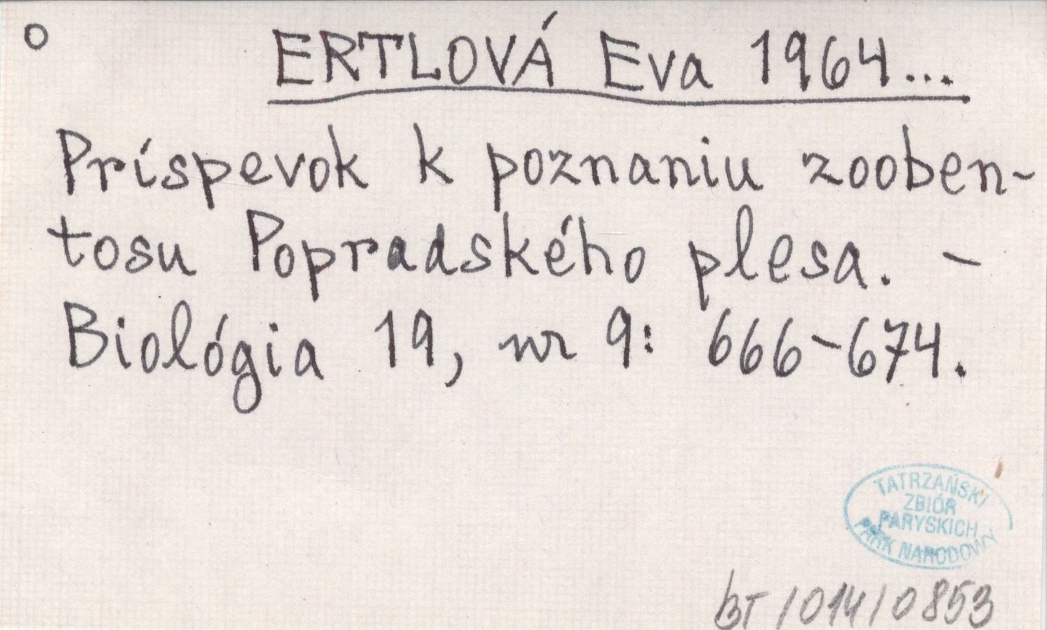 ERTLOVÁ Eva 1964... Príspevok k poznaniu zoobentosu Popradského plesa.