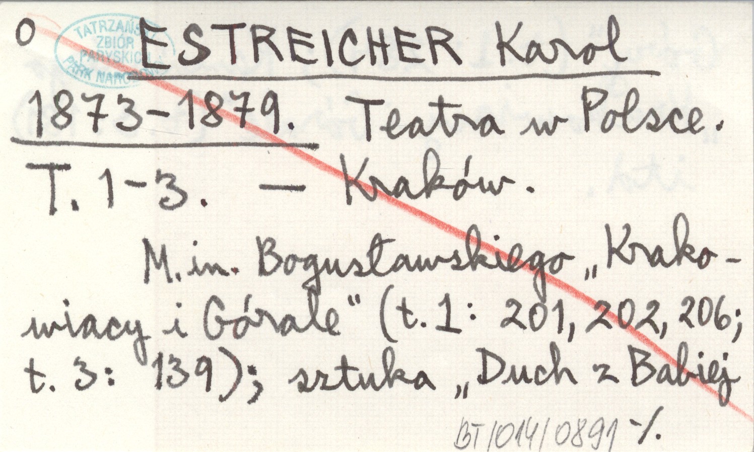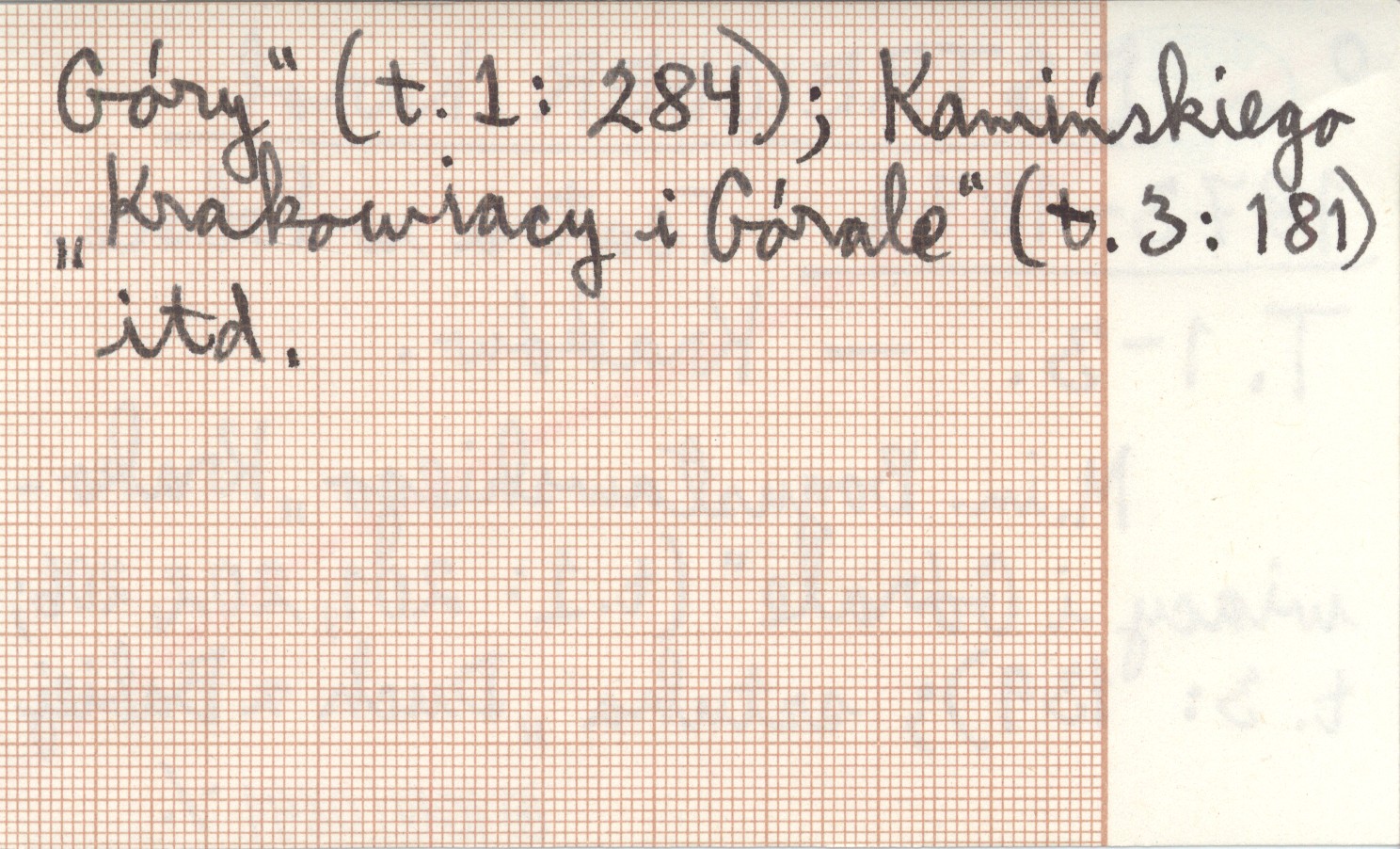 Kraków , T. 1-3. M. in. Bogusławskiego "Krakowiacy i Górale" (t. 1: 201, 202, 206 ; t. 3: 139) ; sztuka "Duch z Babiej Góry" (t. 1: 284) ; Kamińskiego "Krakowiacy i Górale" (t. 3: 181) itd.