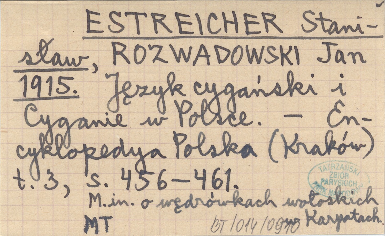 ESTREICHER Stanisław ROZWADOWSKI, Jan. ; 1915 Język cygański i Cyganie w Polsce.