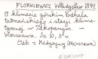 FLORKIEWICZ Władysław 1894 O klimacie górskim Podhala tatrzańskiego i stacji klimatycznej w Zakopanym.