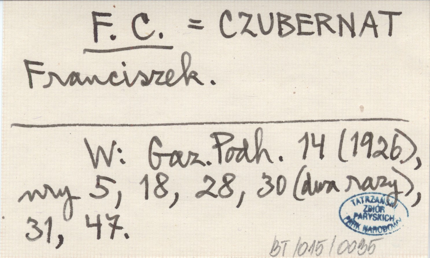 F. C. CZUBERNAT Franciszek Gazeta Podhalańska 14 (1926), nr 5, 18, 28, 30 (dwa razy), 31, 47.