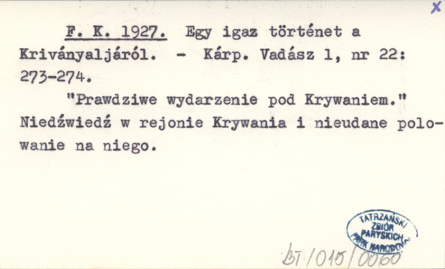 Kárpát Vadász, 1, nr 22: 273-274. "Prawdziwe wydarzenie pod Krywaniem". Niedźwiedź w rejonie Krywania i nieudane polowanie na niego.