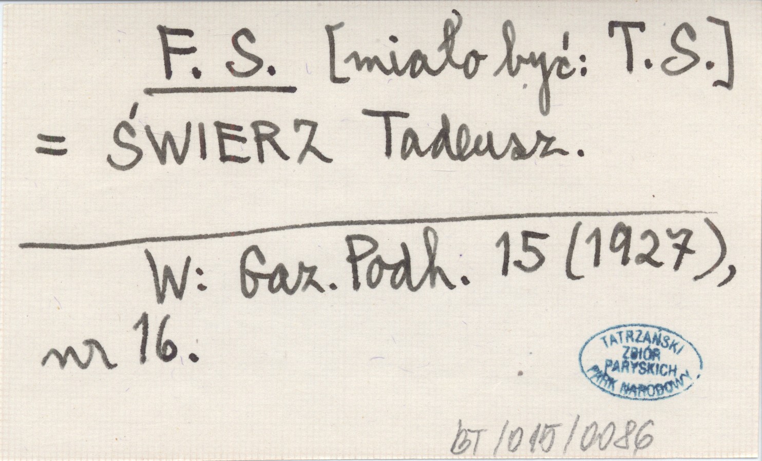 F. S. [miało być: T. S.] ŚWIERZ Tadeusz Gazeta Podhalańska 15 (1927), nr 16.