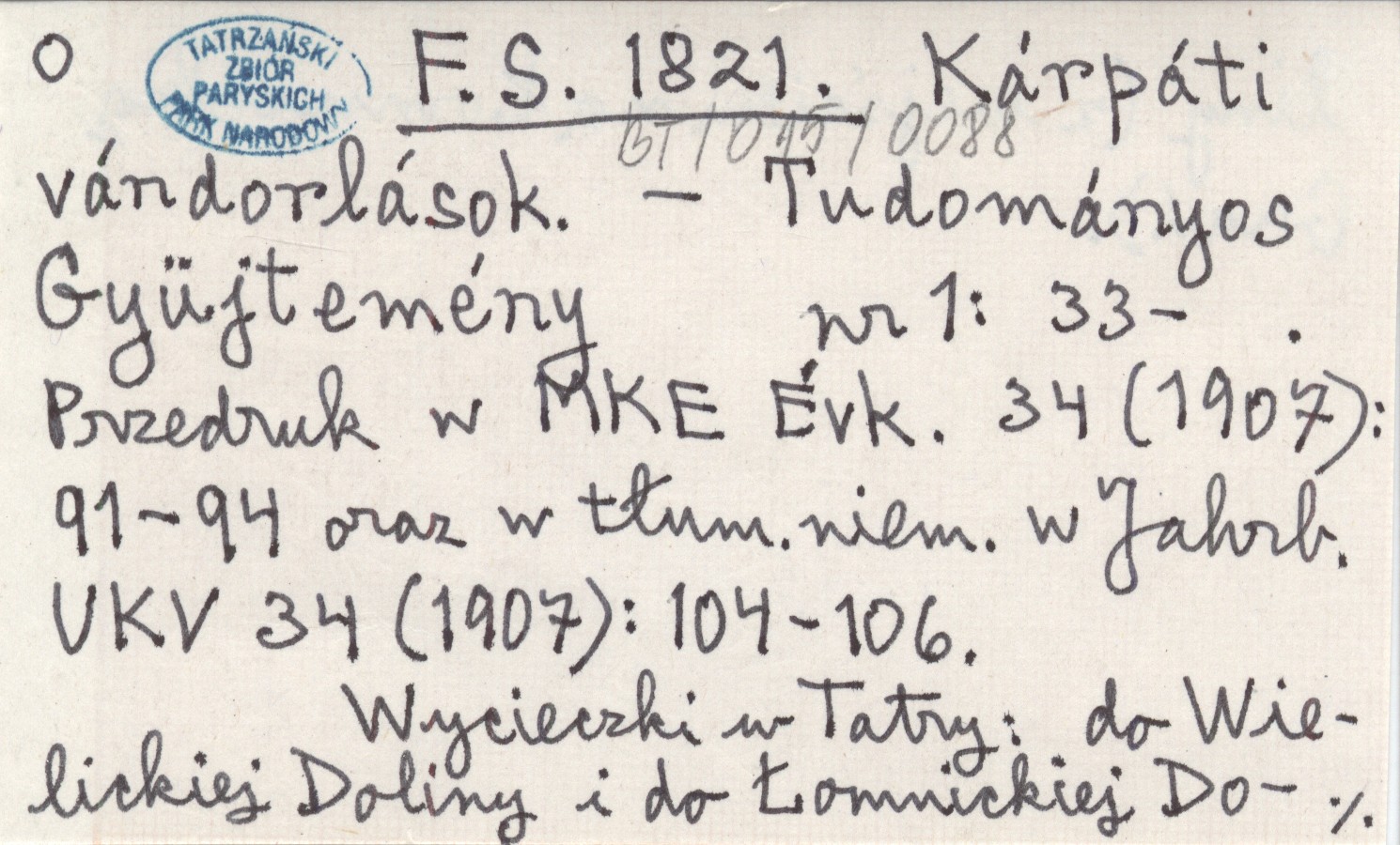 Tudományos Gyüjtemény, Nr 1: 33- . Wycieczki w Tatry: do Wielickiej Doliny i do Łomnickiej Doliny (z wej¶ciem na Łomnick± Grań). Przedruk w Magyarországi Kárpátegyesület Évkönyve 34 (1907): 91-94 oraz w tłum. niem. w Jahrbuch des Ungarischen Karpathen-Vereines 34 (1907): 104-106.