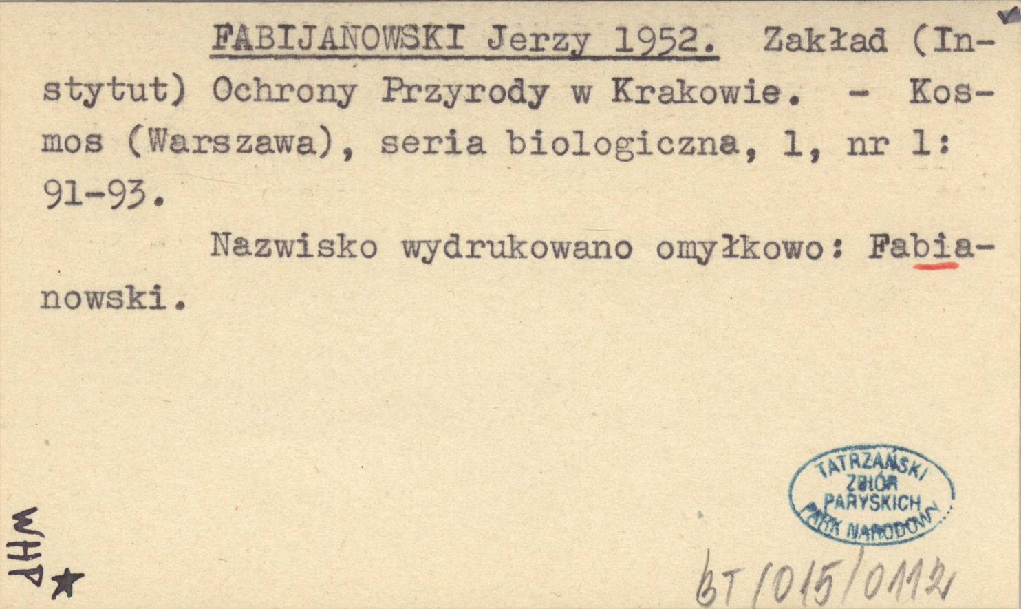 FABIJANOWSKI Jerzy 1952 Zakład (Instytut) Ochrony Przyrody w Krakowie.