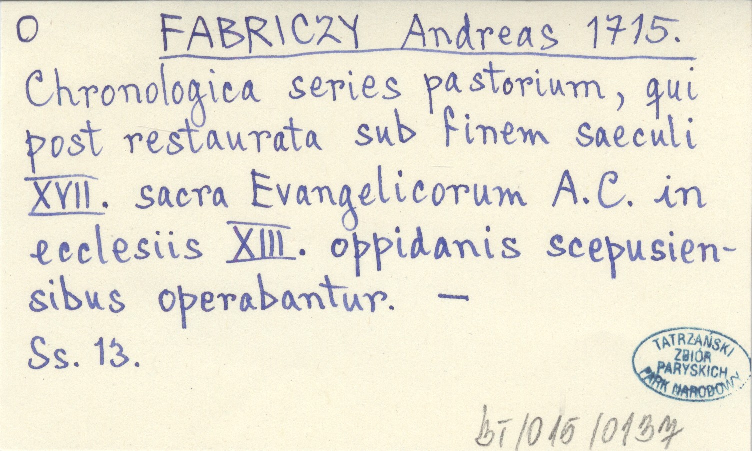 FABRICZY Andreas 1715 Chronologica series pastorium, qui post restaurata sub finem saeculi XVII. sacra Evangelicorum A.C. in ecclesiis XIII. oppidanis scepusiensibus operabantur.