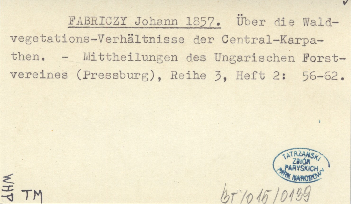 FABRICZY Johann 1857 Über die Waldvegetations-Verhältnisse der Central-Karpathen.