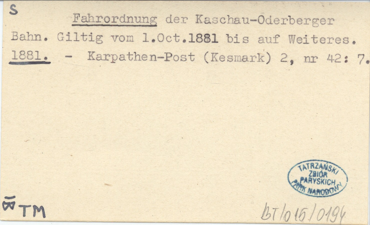 Fahrordnung der Kaschau-Oderberger Bahn. Giltig vom 1. Oct. 1881 bis auf Weiteres. 1881