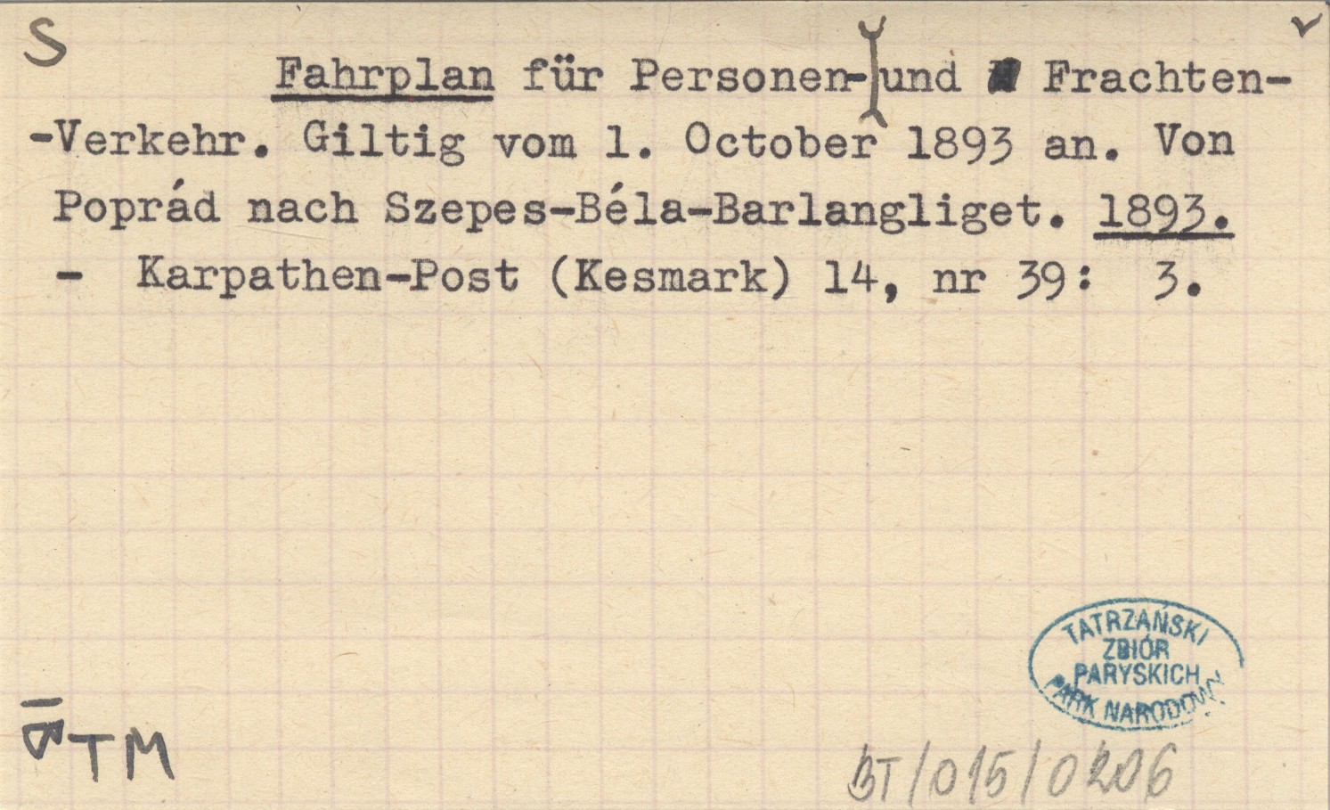 Fahrplan für Personen- und Frachten-Verkehr. Giltig vom 1. October 1893 an. Von Poprád nach Szepes-Béla-Berlangliget. 1893