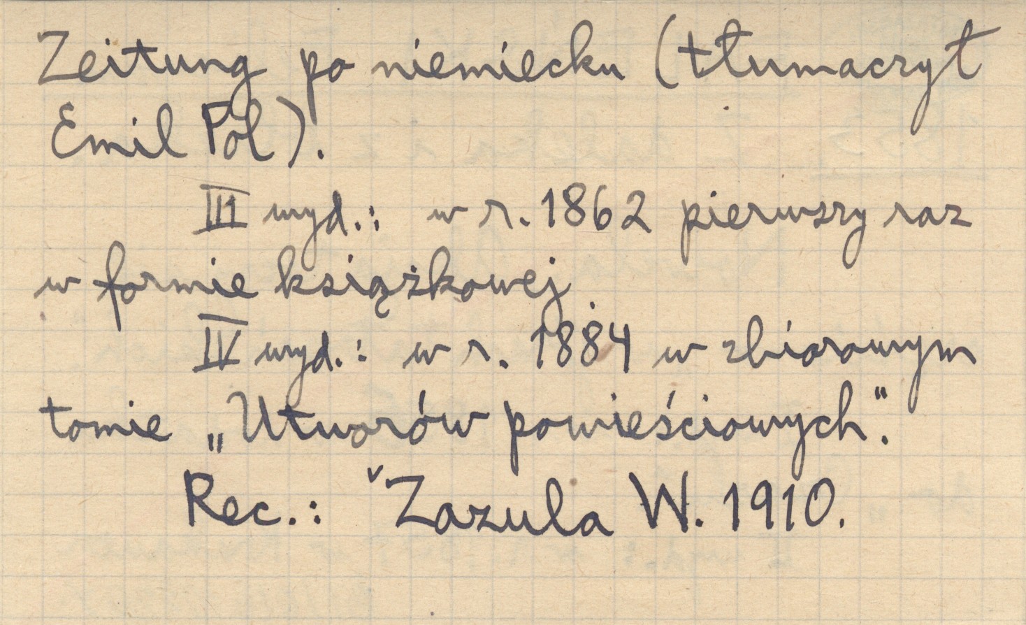 , Nowela. Akcja toczy się częściowo "w górach tatrzańskich". I wyd.: w r. 1856 w dodatku do "Czasu". II wyd.: w r. 1857 w Krakauer Zeitung po niemiecku (tłumaczył Emil POL). III wyd.: w r. 1862 pierwszy raz w formie książkowej. IV wyd.: w r. 1884 w zbiorowym tomie "Utworów powieściowych". REC: ZAZULA W. 1910