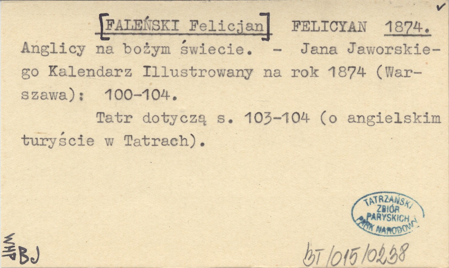 Jana Jaworskiego Kalendarz Illustrowany na rok 1874 (Warszawa) , S. 100-104. Tatr dotyczą s. 103-104 (o angielskim turyście w Tatrach).