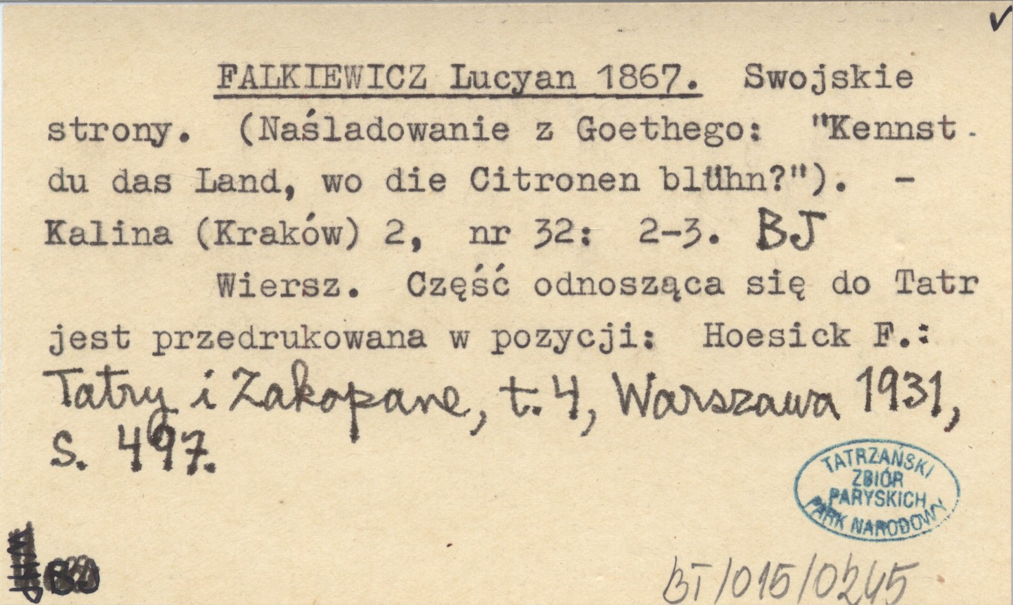 Kalina (Kraków) , 2, nr 32: 2-3. Wiersz. Część odnosząca się do Tatr jest przedrukowana w pozycji: HOESICK F.: Tatry i Zakopane, t. 4, Warszawa 1931: 497.
