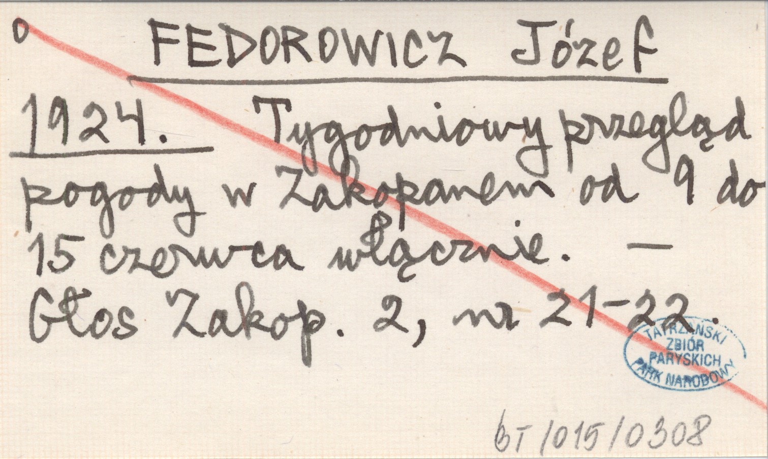 FEDOROWICZ Józef 1924 Tygodniowy przegląd pogody w Zakopanem od 9 do 15 czerwca włącznie.