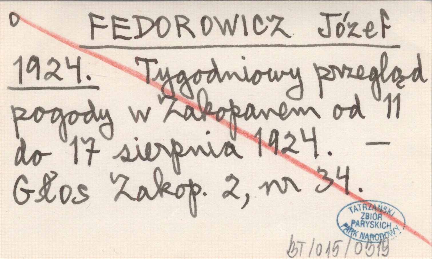 FEDOROWICZ Józef 1924 Tygodniowy przegląd pogody w Zakopanem od 11 do 17 sierpnia 1924.